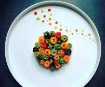 菜类盘饰主要利用可食用的蔬菜来创意造型,如瓜类、菜叶类、根茎类等。 常用蔬菜:黄瓜、胡萝卜、白萝卜、心里美萝卜、西红柿、青椒、西兰花、香菇等。 黄瓜切薄片,折叠成适合的样式,沿圆盘摆成圆形围边,搭配其它