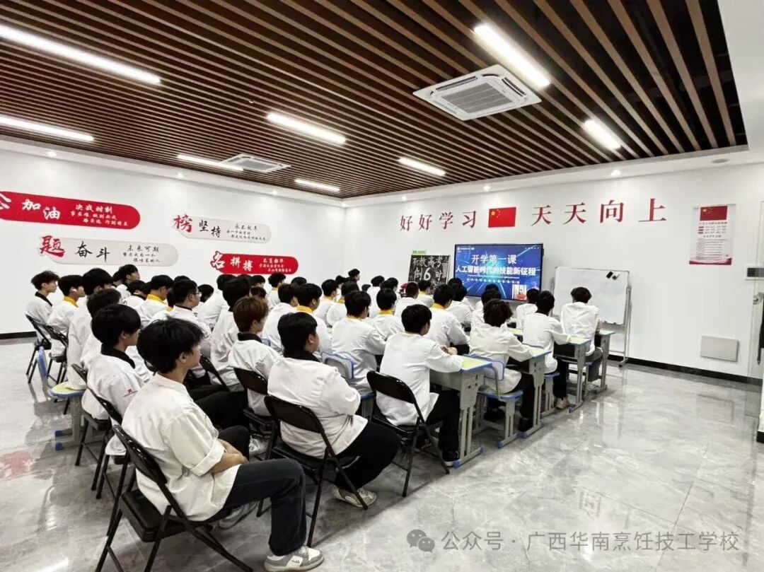 人工智能时代 的技能新征程 广西华南烹饪技工学校开学第一课 开启人工智能时代的技能新征程 春风送暖,筑梦华南。 在这充满希望与活力的季节,广西华南烹饪技工学校迎来了意义非凡的开学第一课。本次课堂由 我校校长