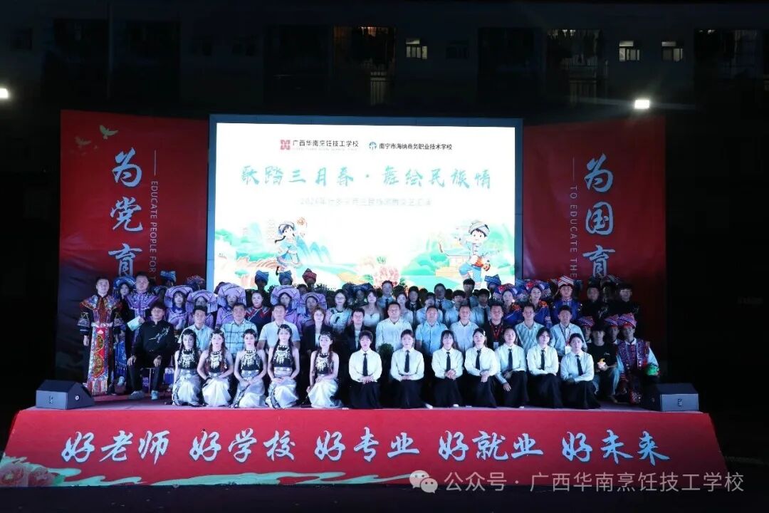 壮乡三月三民族歌舞文艺汇演 广西华南烹饪技工学校 铜鼓声声踏歌来,锦绣壮乡春满怀,四月的壮乡,山歌嘹亮;青春的校园,舞姿翩跹。 2026年4月15日晚,广西华南烹饪技工学校东盟校区灯火璀璨、欢歌如潮。由全校师生