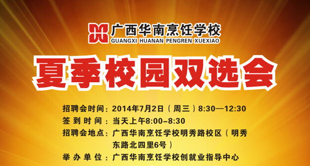 尊敬的用人企业负责人: 您好!感谢贵企业一直以来对我校毕业生就业工作的大力支持! 广西华南烹饪学校成立于1996年,是国家大型的厨师技能人才培训基地,十八年来,在上级主管部门的正确领导下,以社会发展和教育改