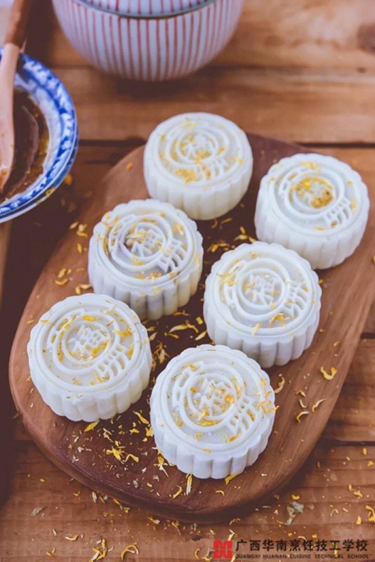 5、取一块山药泥,按扁,放入枣泥,包起来,收口滚圆,放入月饼模中;