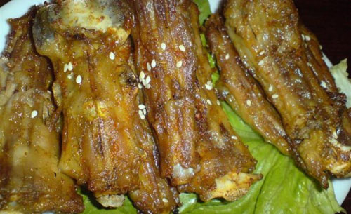 (3)在做羊尾这前就应在锅上加热油,热后改中火此时正好放入羊尾炸。以此法重复直至全部完成。