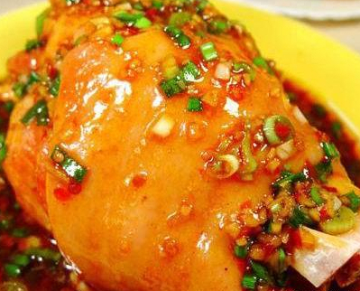 6.炒勺上火,将汤汁烧开,加味精,用湿淀粉勾芡,淋入明油,浇在肘子上,撒上香菜段即成。