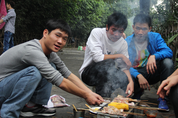 上午9时,大家准时出发,车辆奔驰在宽阔的马路上,行往狮山公园。车行至目的地,大家马不停蹄的开始忙活起来,几个学生在老师的帮助下,抬出烧烤架子,烧起了炭火,剩下的人也没有闲着,把大家今天的“美味”拿了出来,洗的开洗,串的开串,一片忙碌。