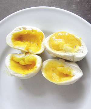 流沙包内馅通常是用红心咸蛋黄、吉士粉、黄油拌匀做成。但是当天内馅用的是普通咸蛋黄,为让内馅也有红心咸蛋所呈现的艳丽橙红色,于是在内馅里也添加了这两种色素,咸蛋黄立刻明艳照人。将准备好的馅料包入面皮当中,上锅蒸10分钟,流沙包便出炉了。