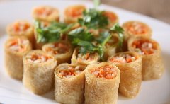 材料: 腐皮、木耳、冬菇、红萝卜、草菇、金针菇、玉米、手指笋(各适量) 步骤: 1、将除腐皮外的所有材料切丝,放入开水中飞水。 2、烧热油锅,倒入飞过水的材料快炒,加入酱油、香油、胡椒粉、盐调味,盛起。 3、